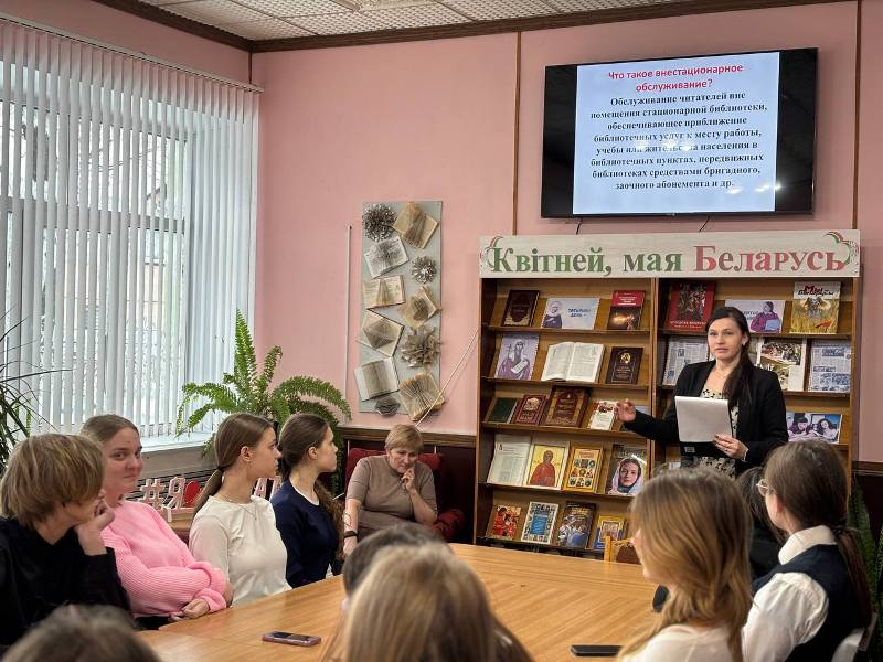 = 16 и 22 января в центральной районной библиотеке в рамках программы библиотечно-информационный лицей прошли уроки профориентации ”Зову в свою профессию“. Участниками стали ученики 9 ”А“ и 9 ”Б“ классов ГУО ”Средняя школа №3 г. Лепеля“. Тема встречи – ”Внестационарное обслуживание“. Заведующий отделом маркетинга, социокультурной деятельности и методической работы Думная Ю.А. и заведующий отделом обслуживания и информации Павлючкова А.А. рассказали учащимся о работе книгоноши, библиобуса, выездного читального зала и о библиотечных пунктах, в которых работает наша библиотека. Ребята приняли участие в блиц-опросе ”Верю/Не верю“, а также активно отвечали на ситуационные вопросы по внестационарному обслуживанию. В завершение мероприятия участникам встречи был предложен к просмотру видеоролик о работе бибилиобуса в отдаленных населенных пунктах Беларуси.