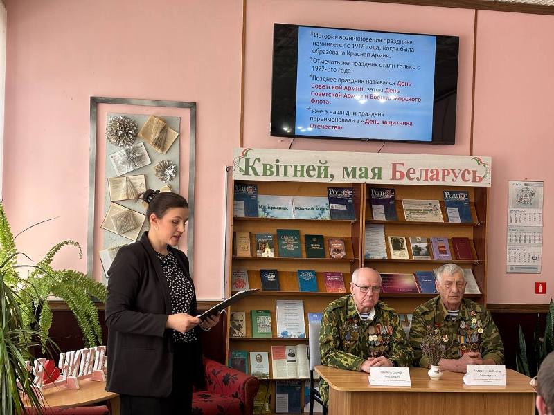 = 16 февраля в читальном зале центральной районной библиотеки в рамках программы ”Лабиринты закона“ для учащихся ГУО ”Лепельский государственный аграрно-технический колледж“ прошел час вопросов и ответов ”Глазами и сердцем солдата“. На встречу с учащимися были приглашены председатель районной организации воинов-интернационалистов Сергей Кривель и член совета Лепельской районной организация ОО БСВВА Виктор Андрейчиков. Гости мероприятия рассказали ребятам, что значит быть патриотом своей страны и нести нелегкую военную службу. Подростки с большим интересом слушали рассказ о том, какой была жизнь воина-интернационалиста вдалеке от дома, в суровых боевых условиях и как все мечтали вернуться к родным и близким. Сергей Кривель напомнил, что человек немыслим без Родины, края, места, где он родился. Он призвал всех ребят с гордостью и честью отслужить в Вооруженных силах Республики Беларусь и нести почетное звание защитника Отечества. В завершение мероприятия сотрудники библиотеки от всей души поздравили всех присутствующих с наступающим праздником 23 февраля.